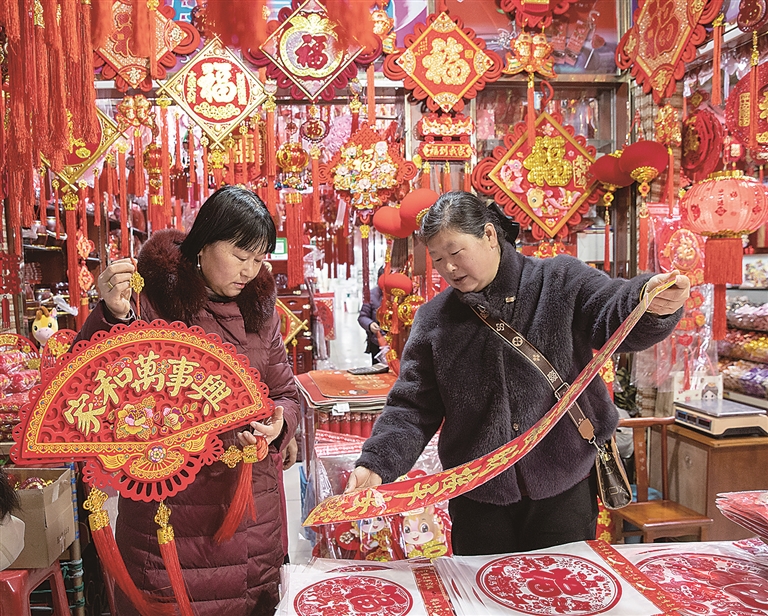 在香港城小商品市场,市民正忙着选购新春饰品。春节临近,新年饰品迎来销售高峰,各类春联、“福”字、灯笼等传统新春饰品销售走俏。陈佳琪 摄
